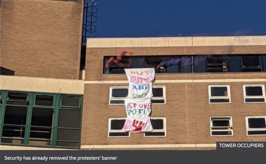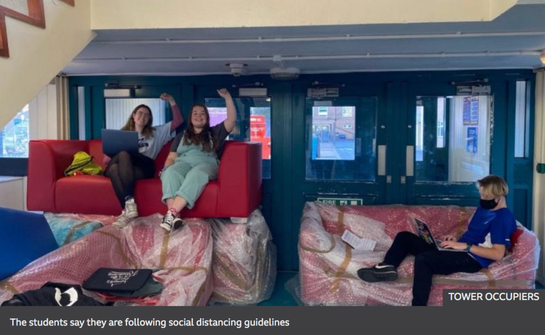 学生们“占领”了曼彻斯特大学的一栋大楼,抗议“天价”租金,以及在冠状病毒期间缺乏支持。他们指责学校“把利润放在学生之前”,并要求租金降低40%。18岁的伊兹·史密斯曼(Izzy Smitheman)说,他们有足够的食物在那里呆一个星期,但还可以再拿一些。
