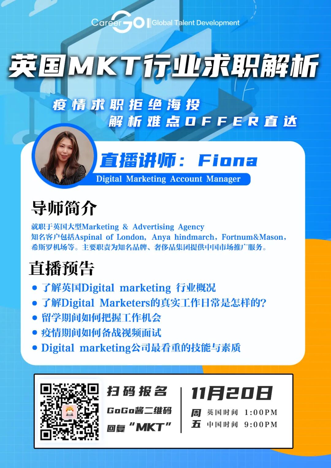 11月20日,CareerGo直播间,来自英国著名Advertising&Marketing Agency的Fiona导师,将亲身授教,详细讲解如何进入英国Marketing行业!