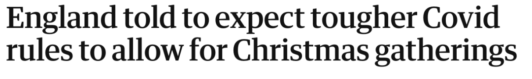 (新闻源:https://www.theguardian.com/world/2020/nov/18/england-told-to-expect-tougher-covid-rules-to-allow-for-festive-gatherings)