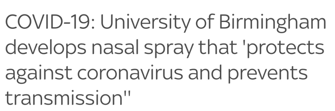 (新闻源:https://news.sky.com/story/covid-19-university-of-birmingham-develops-nasal-spray-that-protects-against-coronavirus-and-prevents-transmission-12136189)