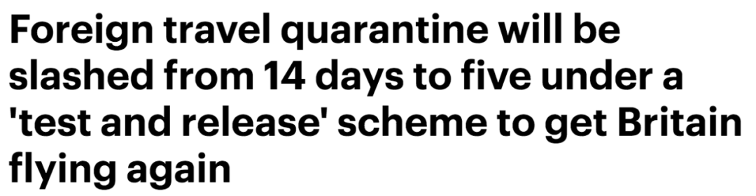 (新闻源:https://www.dailymail.co.uk/news/article-8971963/Foreign-travel-quarantine-slashed-14-days-five.html)
