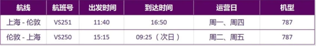| 维珍航空 | 上海-伦敦 | 周一/周二,周四/周五 | zh.virginatlantic.com |