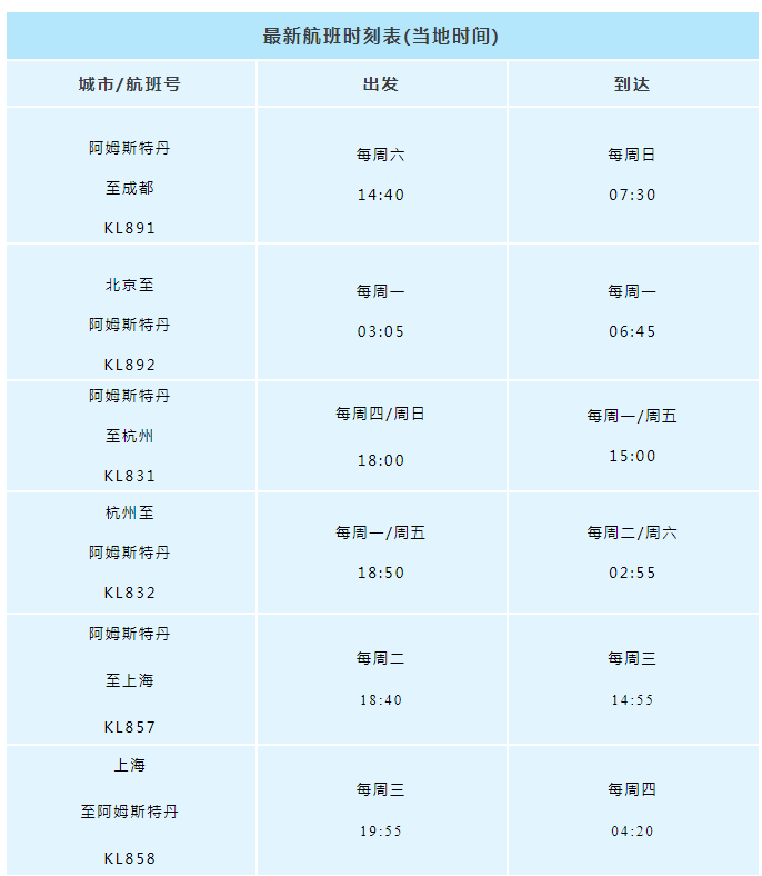 荷兰皇家航空已恢复阿姆斯特丹史基浦机场至成都双流国际机场,北京首都国际机场至阿姆斯特丹史基浦机场的开口程航班,往返上海,杭州的航班也同时运营中。最新航班时刻表如下: