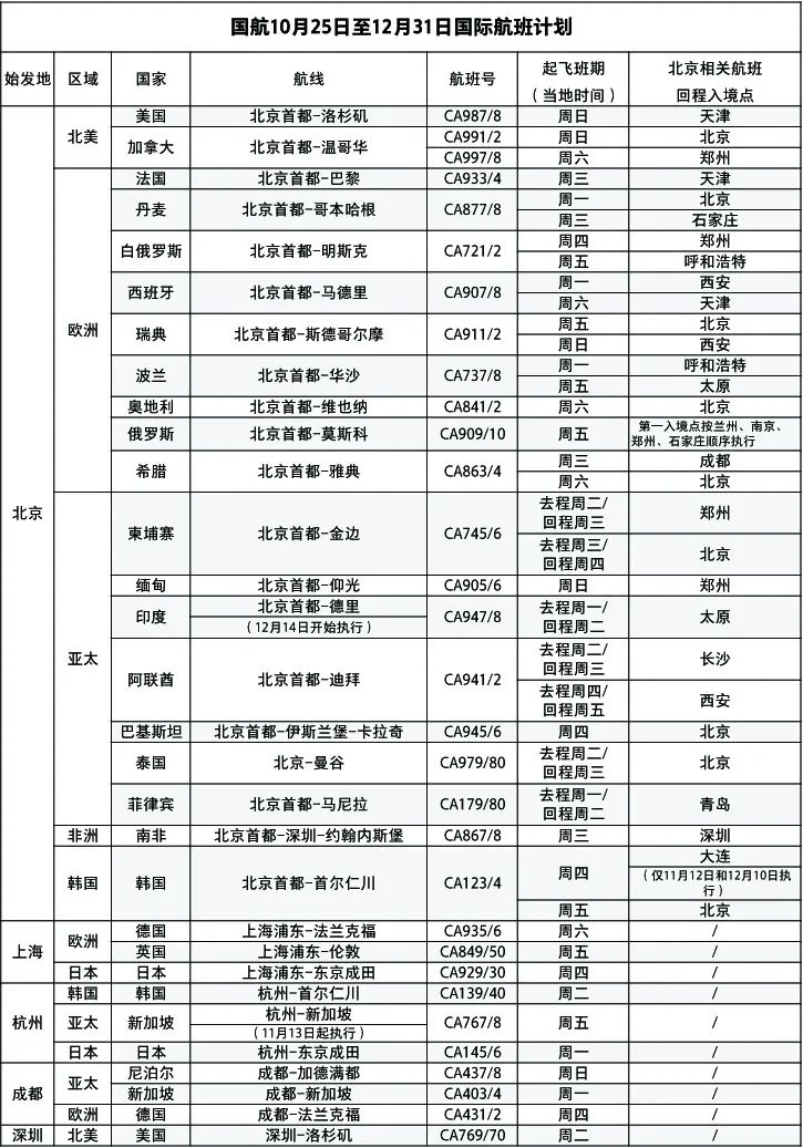 自2020年10月25日0时至12月31日24时,国航每周可执行国际航线共计30条,其中涉及北京分流航线20条,上海国际航线3条,杭州国际航线3条,成都国际航线3条,深圳国际航线1条;其中北京相关航班中,每周五的CA124首尔-北京航班从10月30日起直航北京,直航北京航班将达到每周9个。