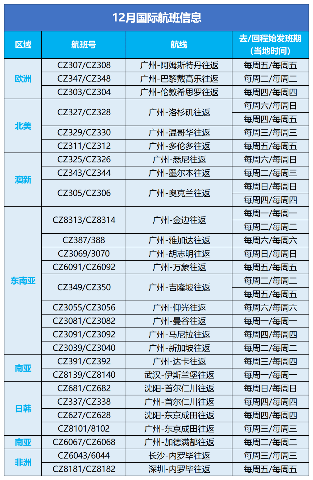 12月,南航每周可执行国际航线共计27条,以下为具体航班计划。