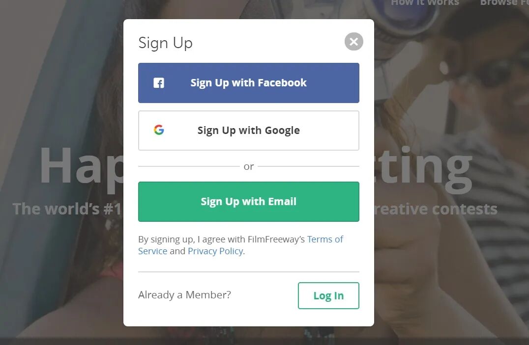 Film Freeway可以使用Facebook,Google,或邮箱账号登陆。邮箱账号建议使用Hotmail/outlook等国际通用邮箱。