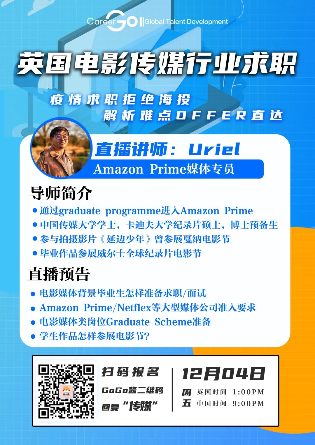 12月04日,Amazon Prime的小哥哥来啦!作品参展过戛纳电影节的中传学长来为你揭秘传媒电影类的就业道路。Amazon Prime/ BBC/ Netflix等的Graduate Scheme要怎么准备呢?