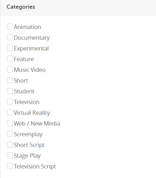 Film Freeway作为一个Festivals汇总类平台其中可参与Festivals的种类也十分丰富,其中包含动画/纪录片/实验动画/摄影作品/实验短片/VR/舞台剧/剧本/新媒体交互 /网页设计,参赛的作品种类繁多,在列表内筛选出合适的项目,查询相关的活动参与即可。