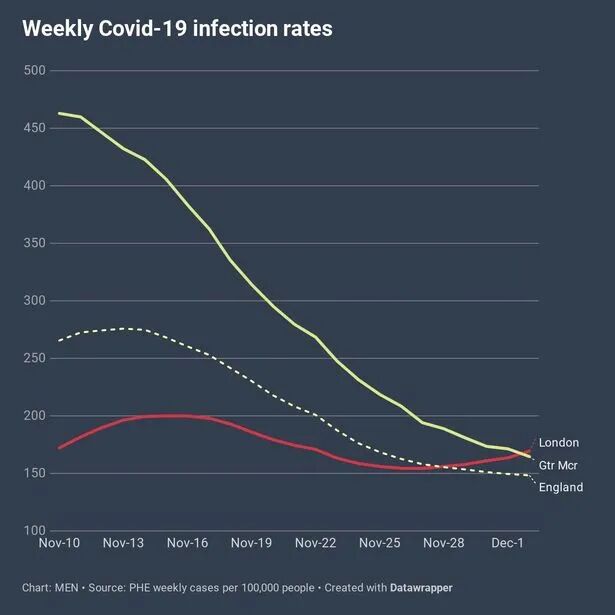 在12月2日结束的那一周,伦敦新冠病例实际上在增加,感染率是每10万人169.32人。同一天在大曼彻斯特,感染率实际上是每10万人中164.65人会被感染。