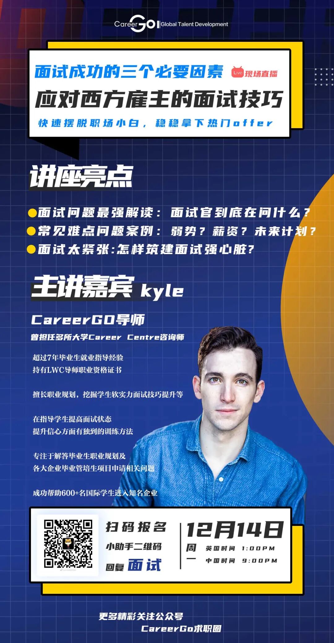12月14日CareerGo直播间,阳光帅气,专业严谨的CareerGo Tutor Kyle来啦!曾有7年大学生就业指导经验的他将带你一举拿下英国本土面试!