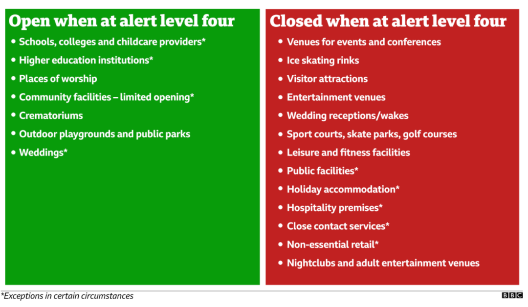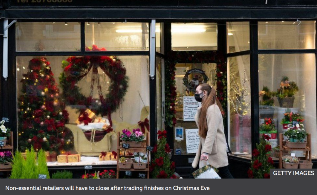 威尔士非必要商店将在平安夜结束交易后关闭,四天后全国将进入闭关锁国状态。像发廊这样的机构也将在圣诞节前关闭。圣诞节当天,所有酒吧和餐馆将在18:00关门。威尔士发出的“明确信息”是,圣诞节期间“只能有两户家庭见面”。因为威尔士的情况“极其严重”,首席部长说,五分之一的人检测出病毒呈阳性。