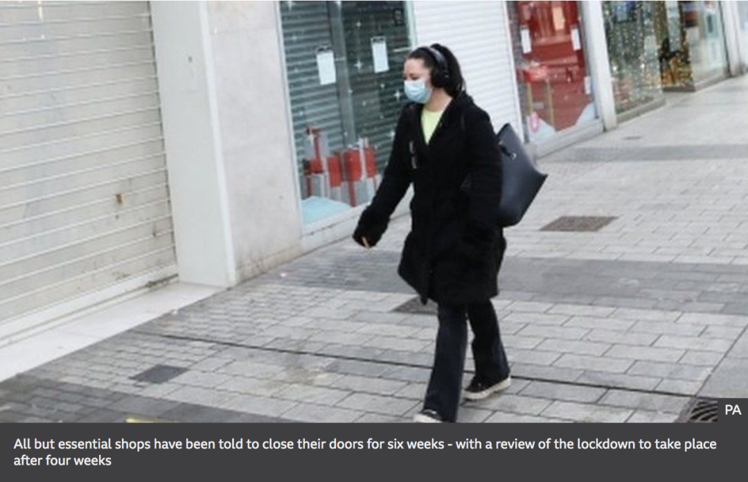 北爱尔兰开始了为期六周的封锁,以阻止Covid-19的传播,非必需品商店被迫关闭。