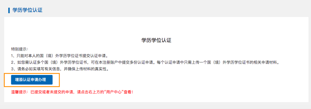 进入【学历学位认证】页面,请点击【增添认证申请办理】