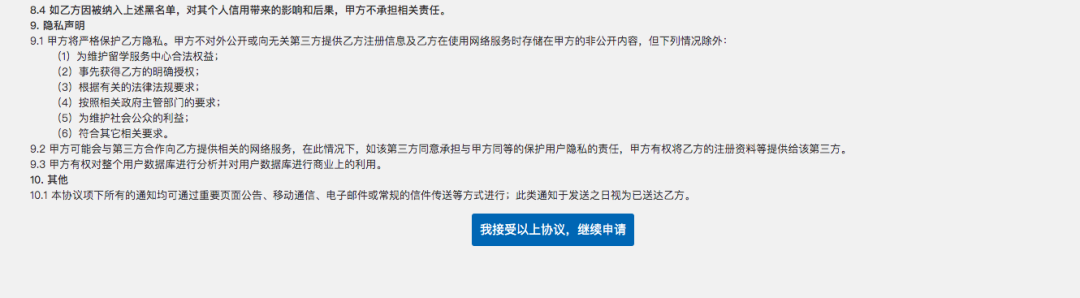 认真阅读协议内容并确认无误后,页面最下方,点击【我接受以上协议,继续申请】