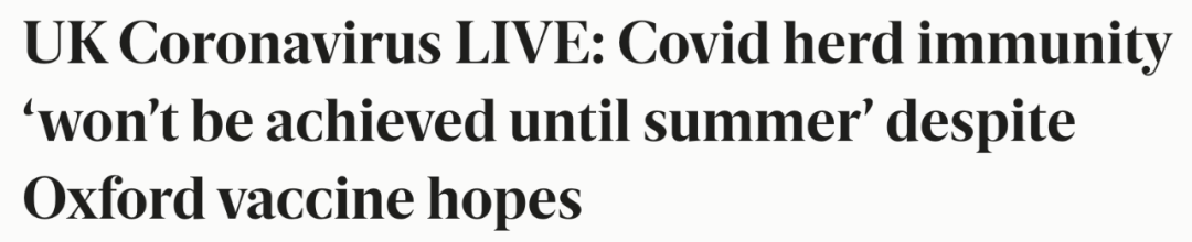 政府科学顾问说,在明年夏天之前英国不太可能通过接种实现对Covid-19的群体免疫。呼吸系统疾病专家、政府紧急情况科学顾问组成员Calum Semple教授说,要实现广泛的保护,“可能需要70%到80%的人口接种疫苗”。人们对牛津/阿斯利康疫苗的希望越来越大,“我们现在可以看到大流行隧道尽头的光明”,这种疫苗预计将在几天内获准在英国使用。