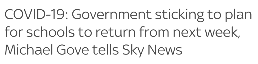 (新闻源:https://news.sky.com/story/covid-19-government-sticking-to-plan-for-schools-to-return-from-next-week-michael-gove-tells-sky-news-12174034)