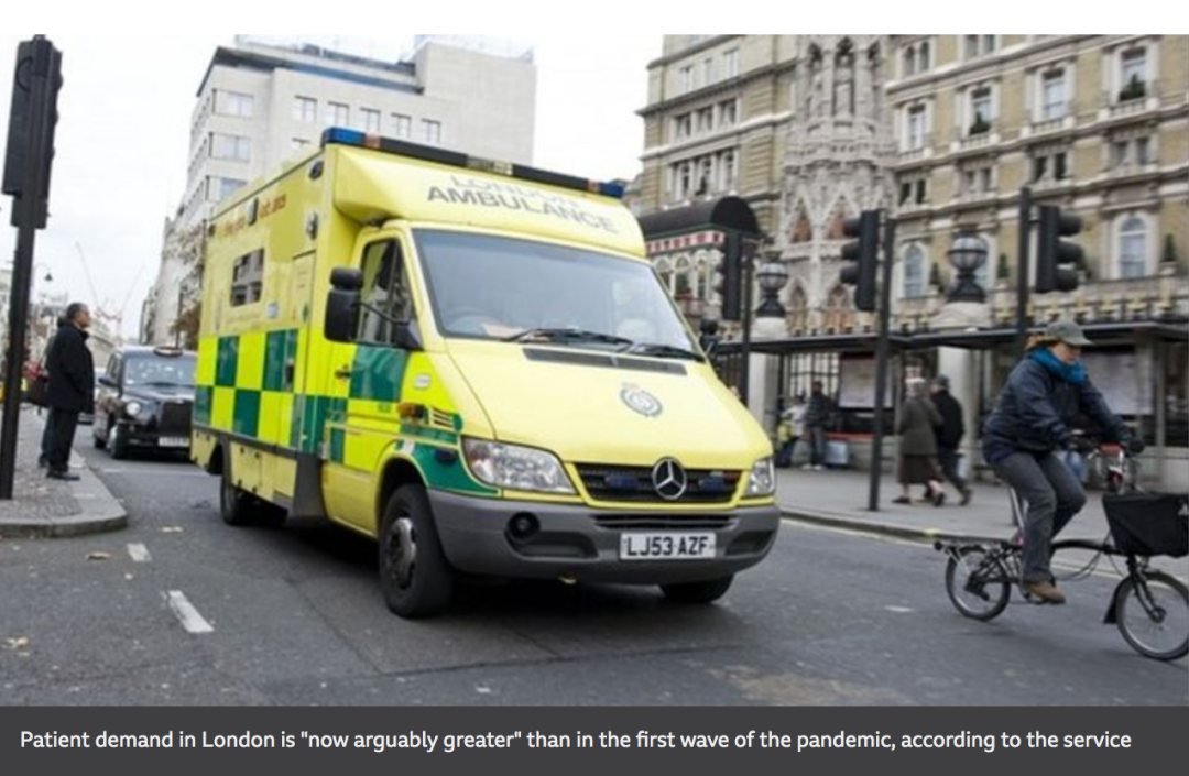 12月26日,伦敦救护车服务(LAS)接到的紧急呼叫数量与Covid-19第一波疫情高峰时一样多。接到近8000个电话,比平常“繁忙”的一天增加了40%。