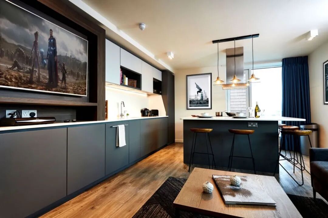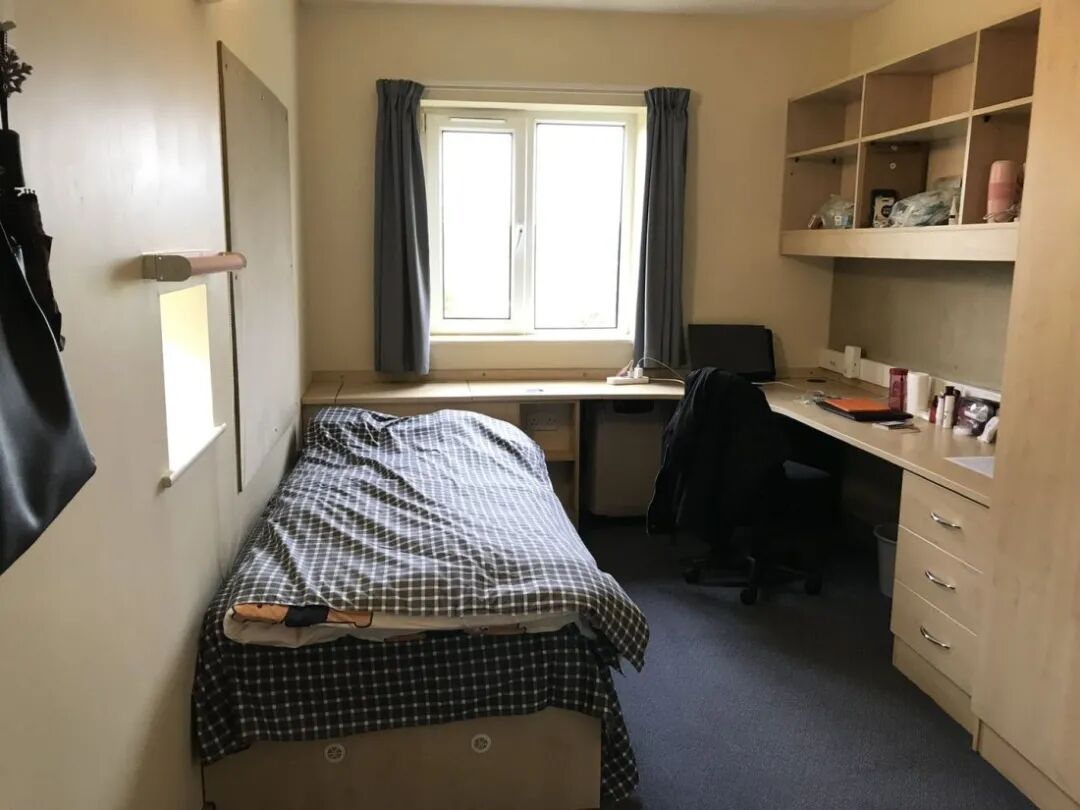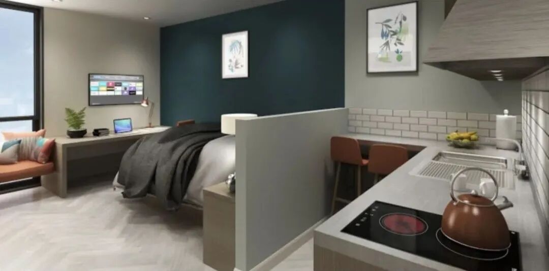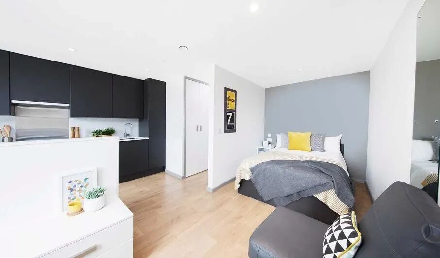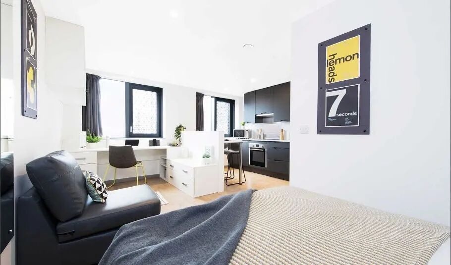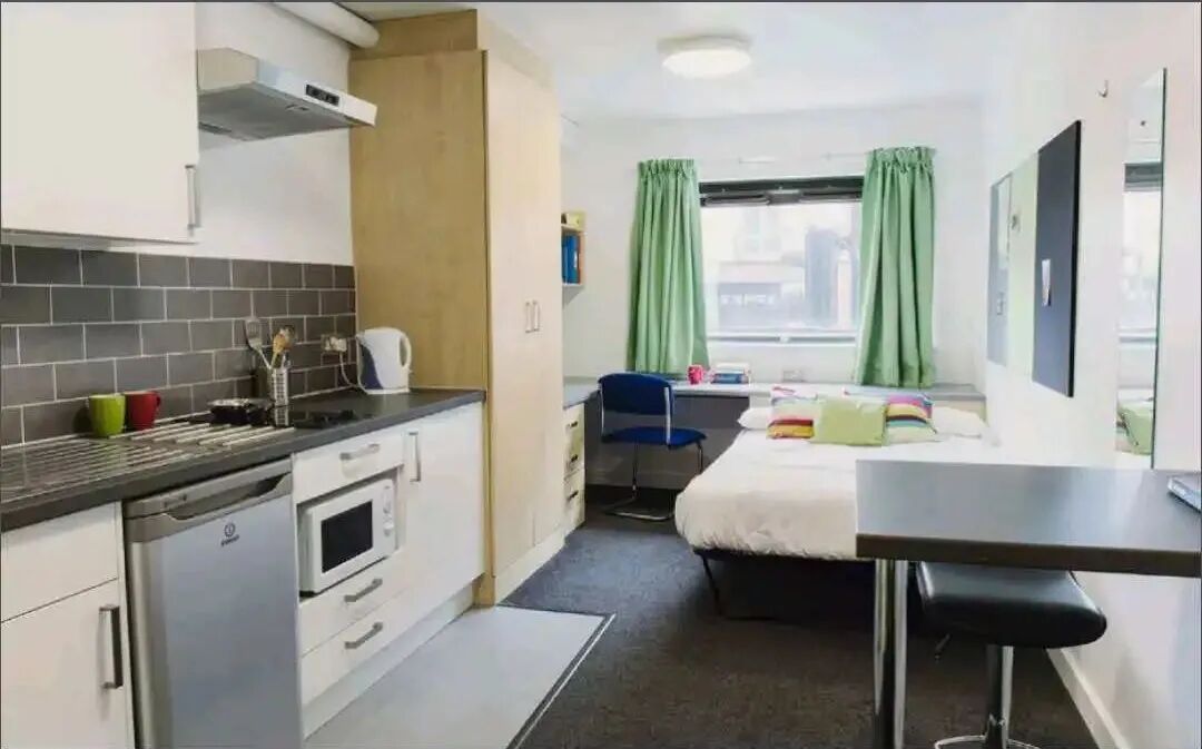 厨房和床分2间,楼下就是中超+中餐馆+公交站,走路5分钟到Tesco,Sainsbury,M&S,走路7分钟到中心商圈,10-15分钟到学校。楼层高不吵、采光好,落地窗