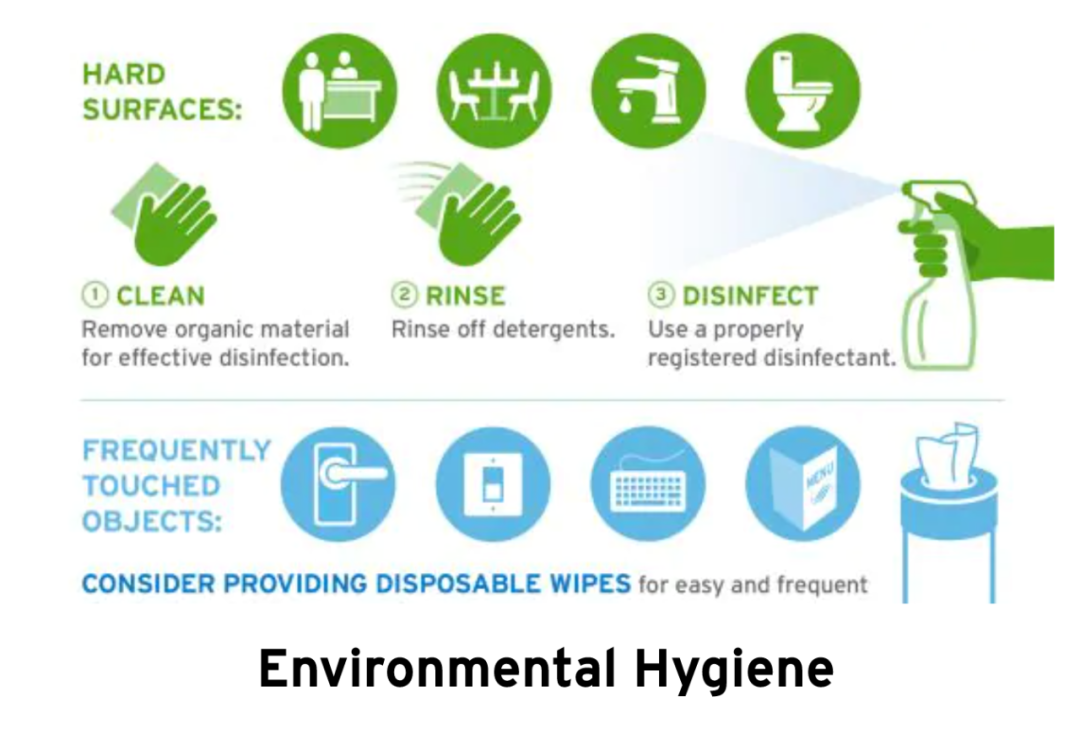 确认患者接触过的所有表面进行清洁和消毒,包括所有可能受到污染和经常接触的区域,如浴室、门把手、电话、走廊扶手和楼梯等,你需要使用一次性布或纸卷和一次性拖把头,清洁所有表面、地板、椅子、门把手,这些清洁设备需要做到一个地点,一次擦拭,一个方向。