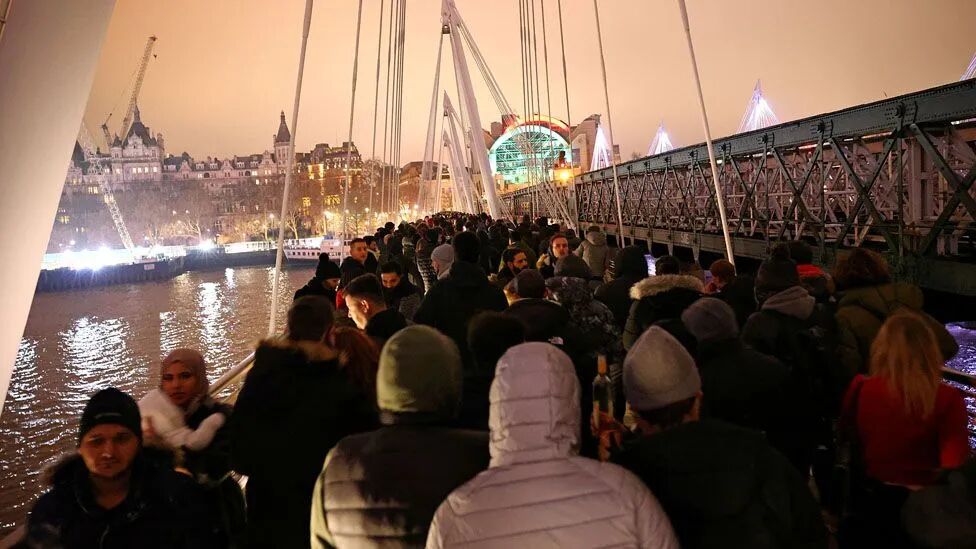 人们在新年前夜穿过伦敦的亨格福德大桥