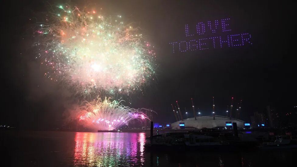 今年的新年前夕,伦敦上空燃放烟花和灯光庆祝了2021年的黎明,主要是向NHS员工致敬。