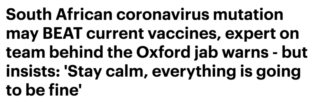 (新闻源:https://www.dailymail.co.uk/news/article-9109397/South-African-coronavirus-mutation-BEAT-current-vaccines.html)