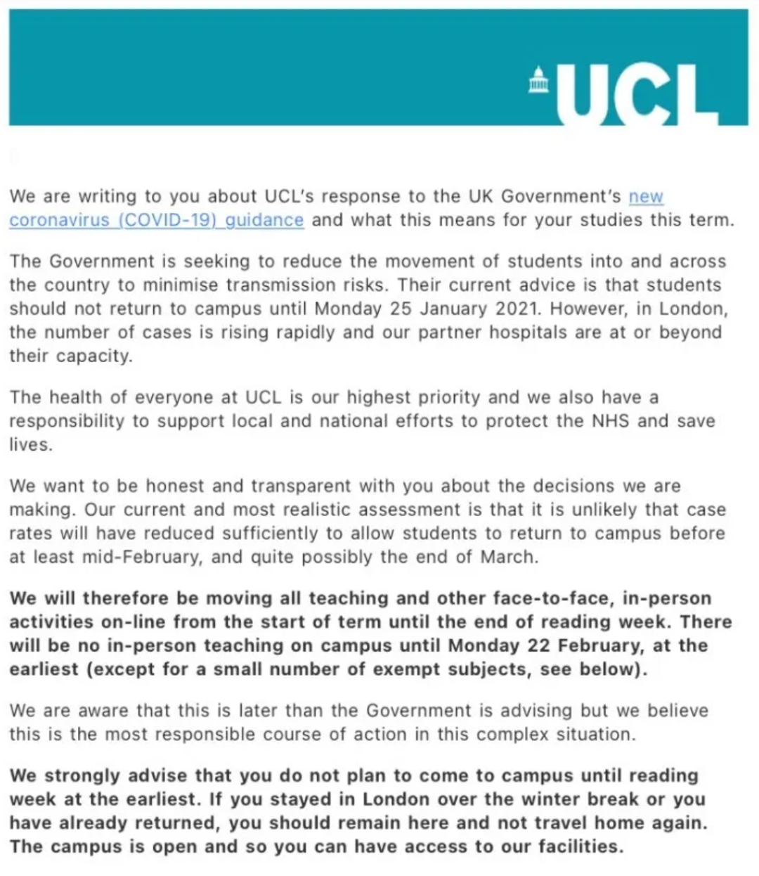 UCL让同学不建议学生2月中旬前回学校
