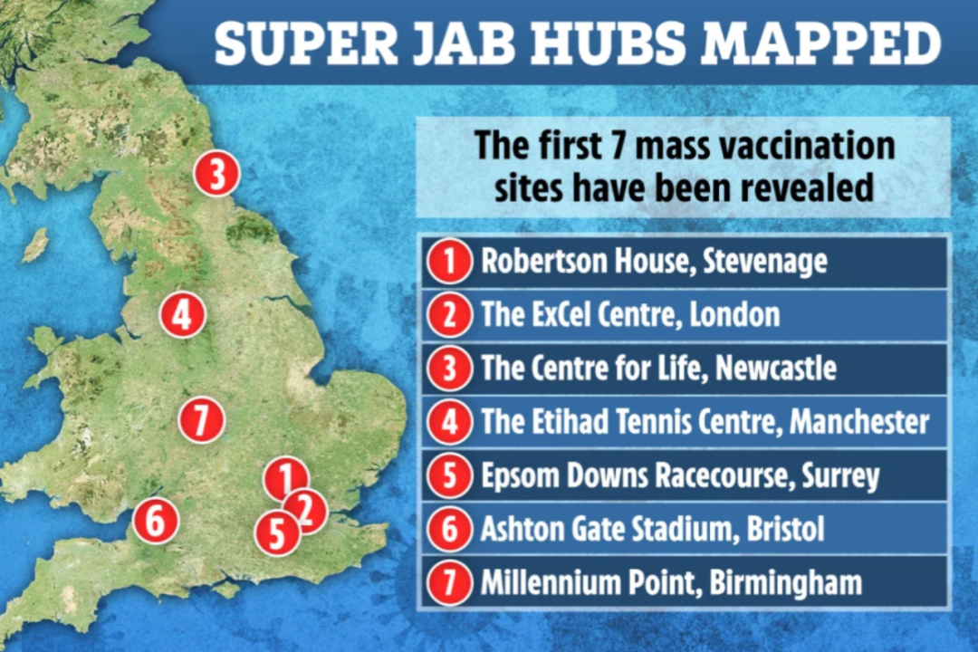 (新闻源:https://www.thesun.co.uk/news/13667316/covid-vaccination-hubs-open-next-week-uk-near-you/)