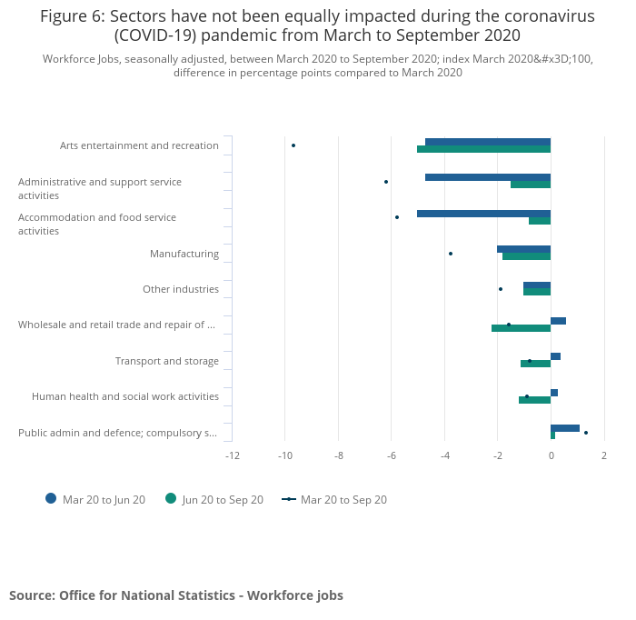 但疫情的冲击根据行业有差异,对零售和酒店业就业的冲击最为显著。反而金融和建筑业的招聘意向却有所增加。英国零售联合会(BRC)的一份报告显示,英国消费者的网上消费额逐步上涨,在线非食品销售额同比增长近50%,而11月非食品支出中有近60%都在网上。由此可见,除酒店旅游等产业,金融、建筑、电商、互联网等企业的招聘仍是积极的。