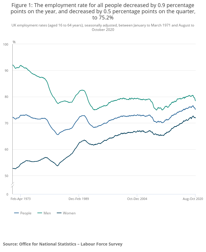 2020年8月至10月间,就业率为75.2%;与去年同期相比下降0.9个百分点。根据英国国家统计局,职位空缺率在2020年9月至2020年11月得到恢复,估计每季度增加110,000个空缺,达到547,000个,但仍低于大流行前的水平,比一年前减少了251,000个(31.5%)。