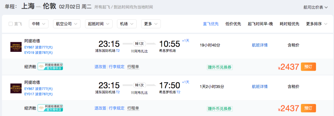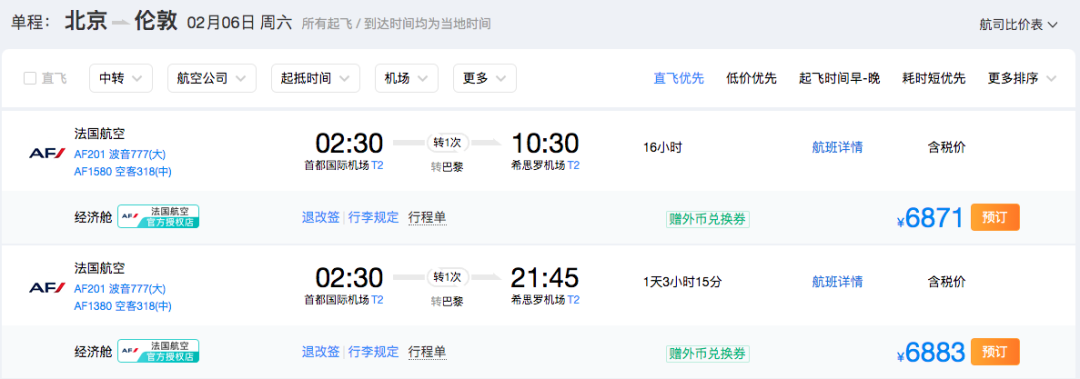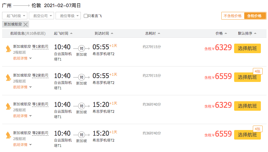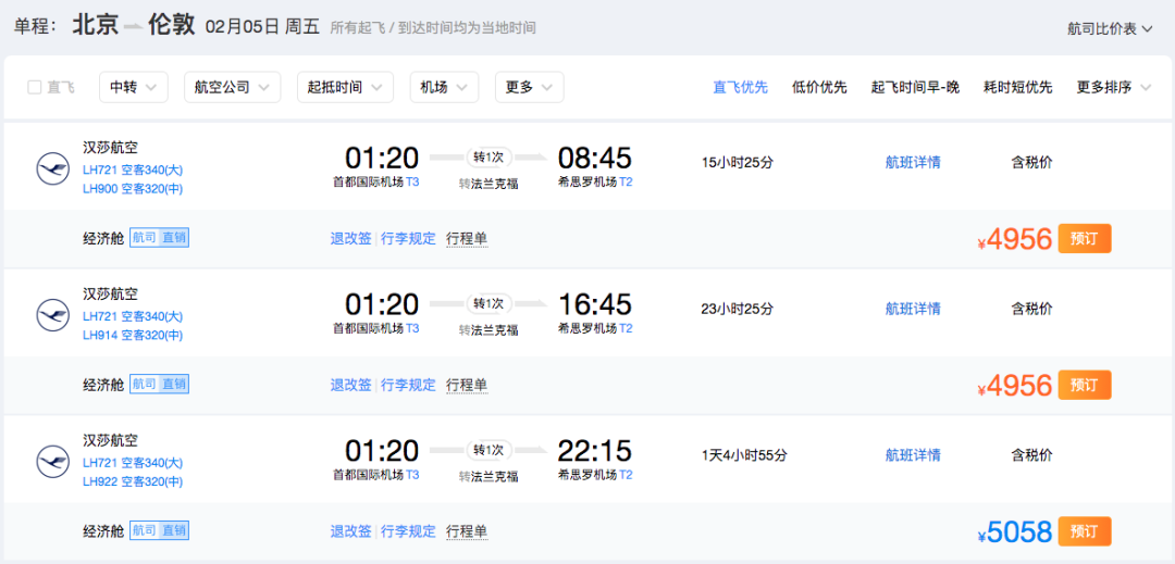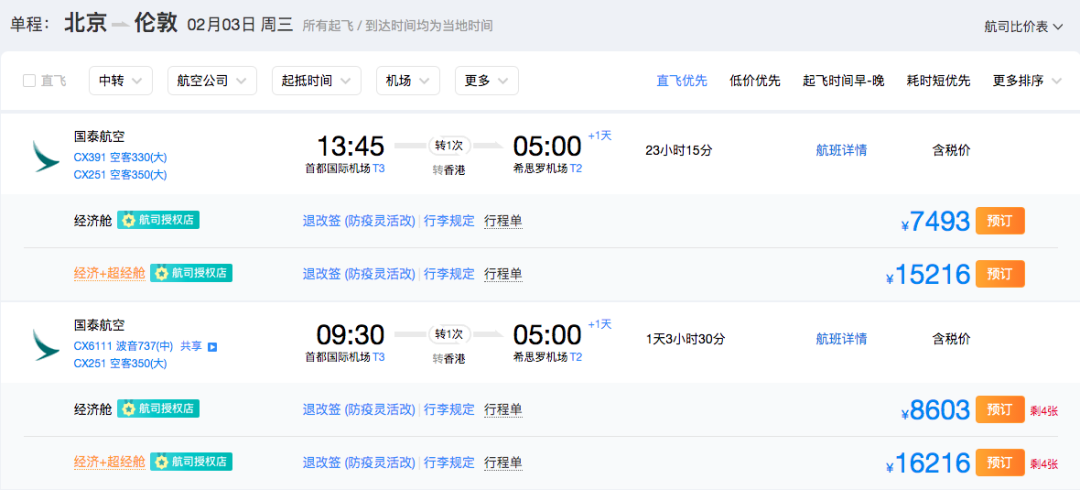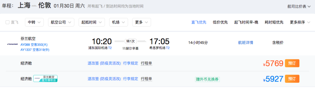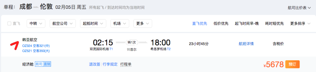 寝室长此次为大家查询的航线均为一次中转,且目的地均为英国伦敦。