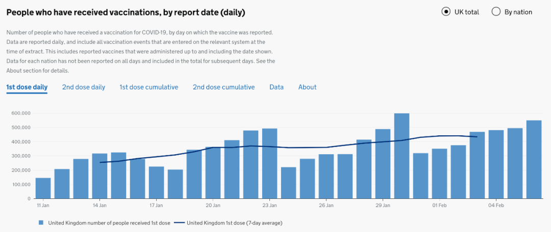 目前英国已有12014288人接种第一剂疫苗,511447人接种第二剂疫苗,昨日接种549078人