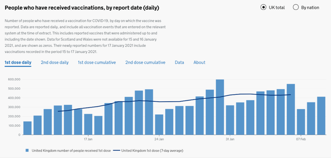 目前英国已有12646486人接种第一剂疫苗,516392人接种第二剂疫苗,昨日接种352480人