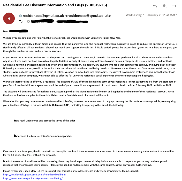 然而,在来自伦敦大学玛丽女王学院住宅学院(QMUL Residences)的一封电子邮件中,该学院给出了模棱两可、“不可谈判”的条款,并仅仅给出了两天的接受期限。
