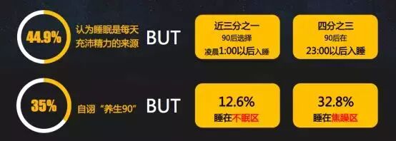而对于中医主张的“子时大睡,午时小憩”的“子午觉”,在90后年轻群体中仅仅有17%以上的人表示能够做到。此外,70%的90后被动起床,并且其中一半人群选择继续赖床,90后是被吸盘吸床上的一代,晚上睡不着,早上起床睡不醒。