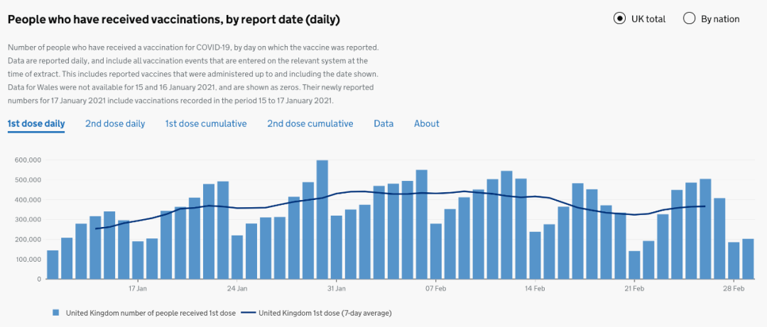 目前英国已有20,478,619人接种第一剂疫苗, 815,816人接种第二剂疫苗,昨日接种203,168人