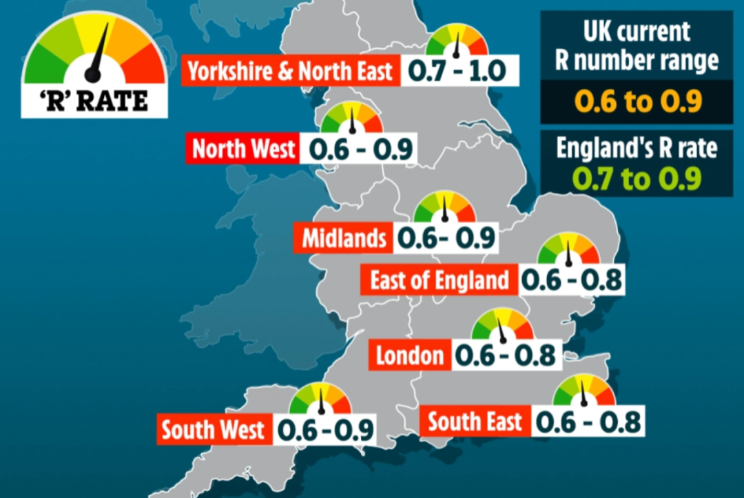 英国政府科学家今天的最新估计显示,英国冠状病毒的繁殖率现在估计在0.6至0.8之间。这比上周的数据略有下降,当时的R率被认为在0.7到0.9之间。