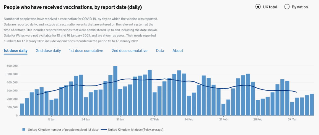目前英国已有 23,314,525人接种第一剂疫苗, 1,445,078人接种第二剂疫苗,昨日接种260,809人