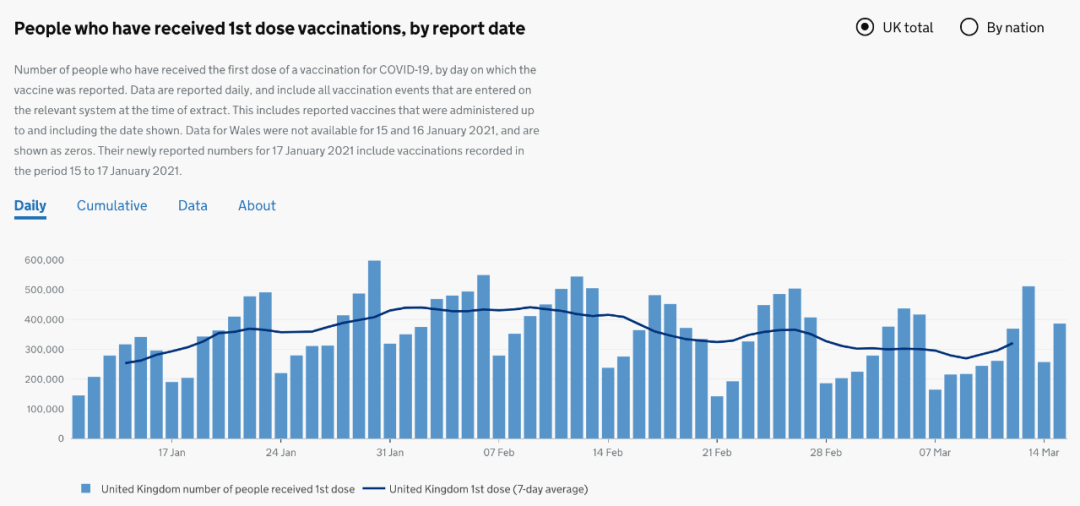 目前英国已有 24,839,906人接种第一剂疫苗, 1,663,646人接种第二剂疫苗,昨日接种386,685人