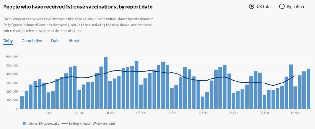 目前英国已有 25,735,472人接种第一剂疫苗, 1,879,054接种第二剂疫苗,昨日接种462,246人