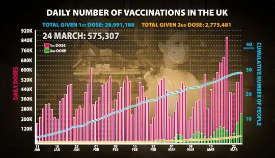 目前英国已有 28,991,188人接种第一剂疫苗, 2,775,481接种第二剂疫苗,昨日接种580,307人