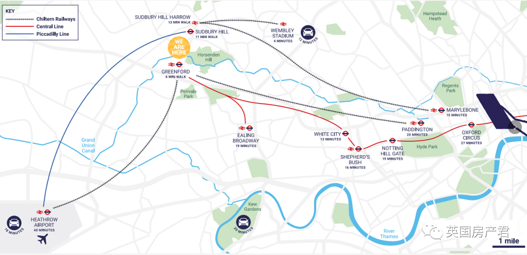 未来伊丽莎白线开通后,从最近的West Ealing站可快速前往伦敦市中心,12分钟到达帕丁顿,15分钟可到邦德街。