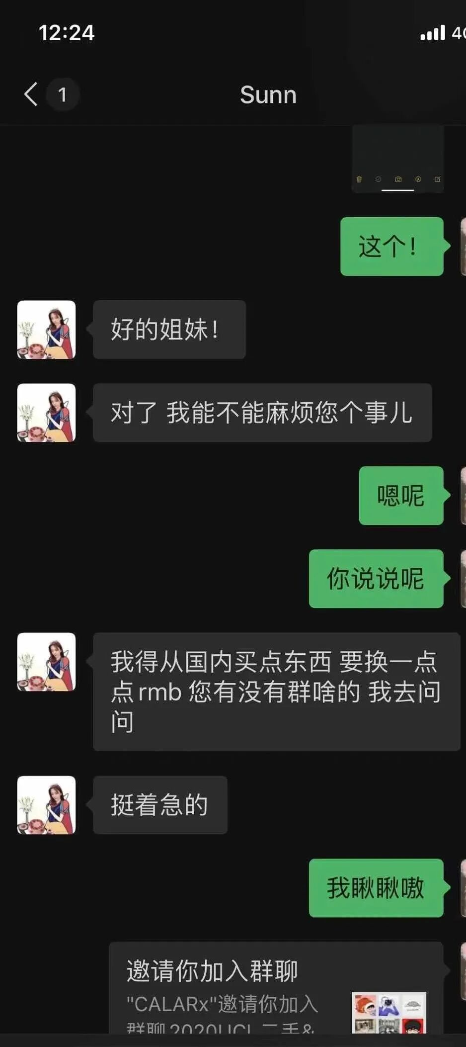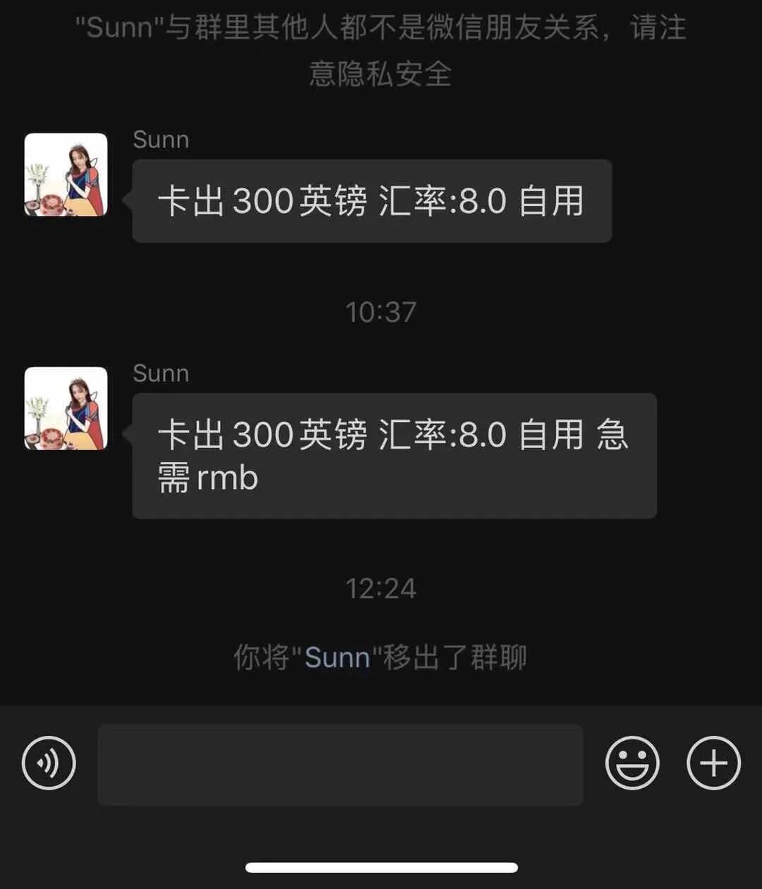 第二步:入群以后随便发一个广告说,自己急需人民币,求换汇,汇率只有8.0!!!