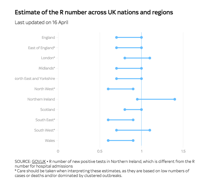 最新数据显示,英国的R值略降至0.7至1之间,而英国各地的冠状病毒感染平均水平大幅下降。上周,政府的紧急情况科学咨询小组(SAGE)估计这个数字在0.8到1之间。