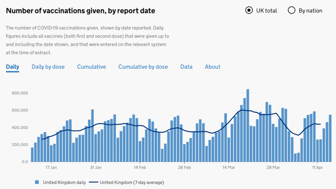 英国在4月15日之前完成了为所有五大优先群体接种疫苗的目标,即所有50岁以上的人以及所有属于高风险类别的人。到目前为止,这些群体占冠状病毒死亡的99%。