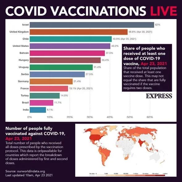 目前英国已有33,388,637人接种第一剂疫苗,11,623,671接种第二剂疫苗,昨日接种562,056人