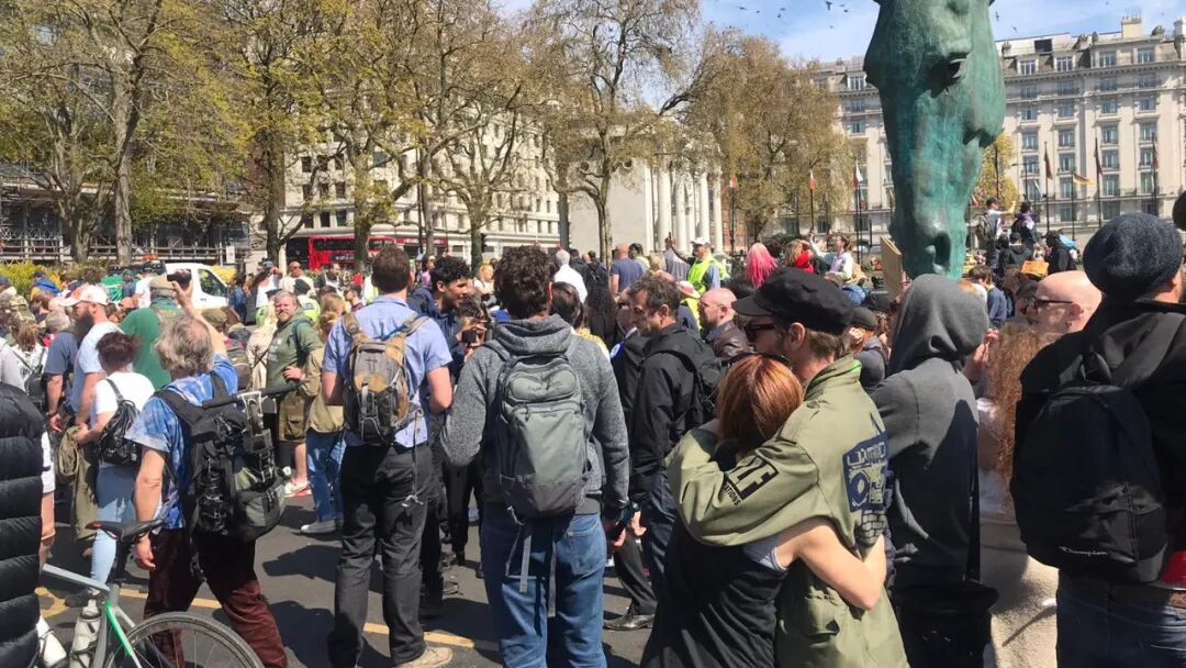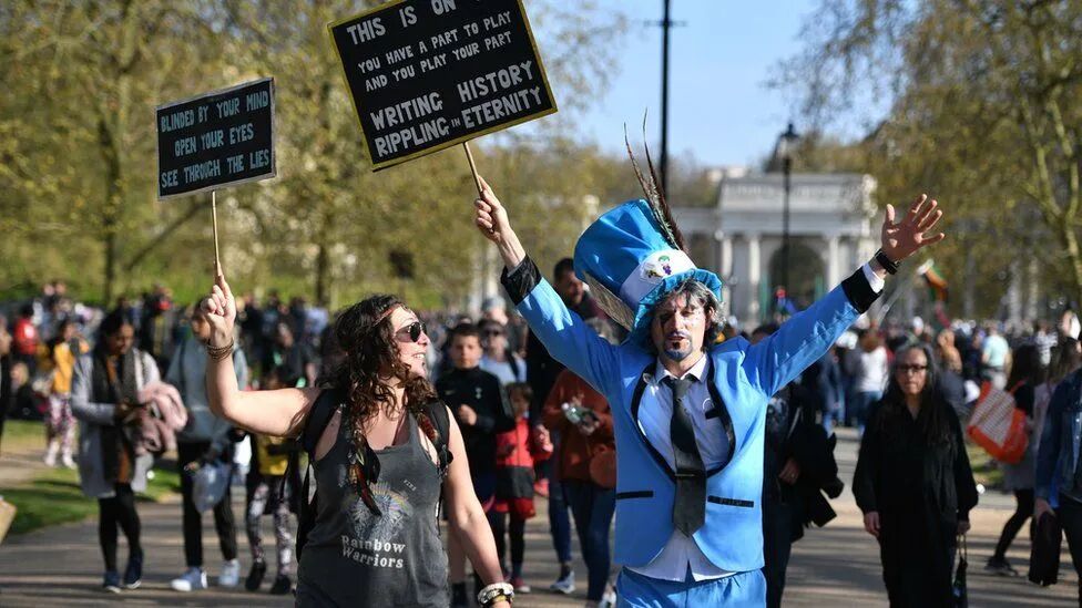 数千人不顾社交距离规则,在伦敦市中心的街道上游行,主要是为了抗议包括口罩和疫苗护照在内的新冠肺炎相关规定。