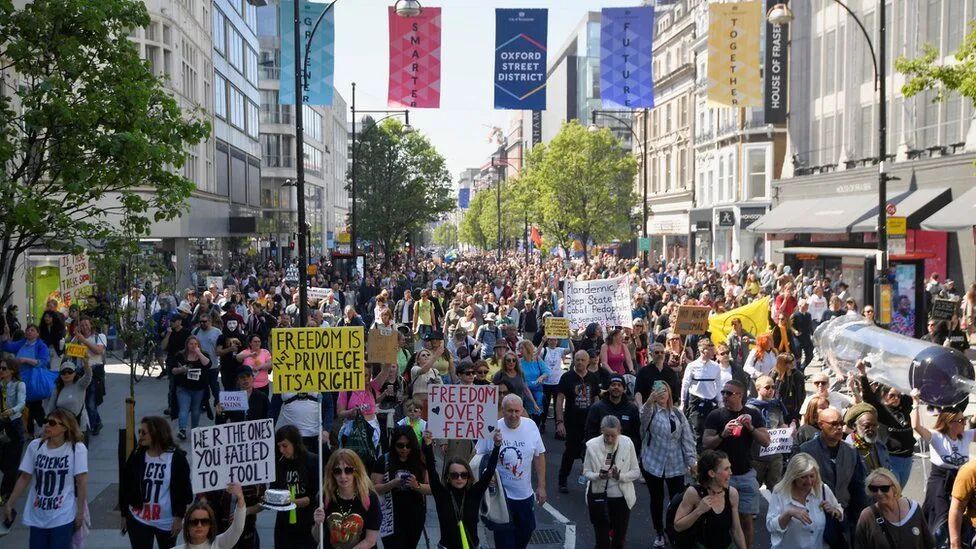 在牛津街(Oxford Street)购物的人们受到了人群的呼吁,要求“摘下口罩”,许多抗议者举着标牌,上面写着关于疫苗的不实与阴谋论。