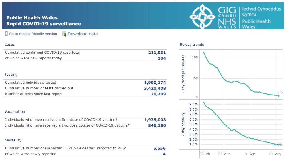 这是自2020年7月30日以来,这国家三个地区首次在一天内没有新冠肺炎死亡病例。威尔士仅四人死亡。