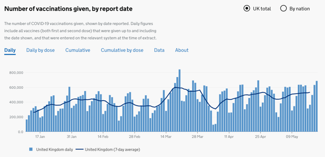 目前英国已有37,518,614人接种第一剂疫苗,21,659,783接种第二剂疫苗,昨日接种688,563人